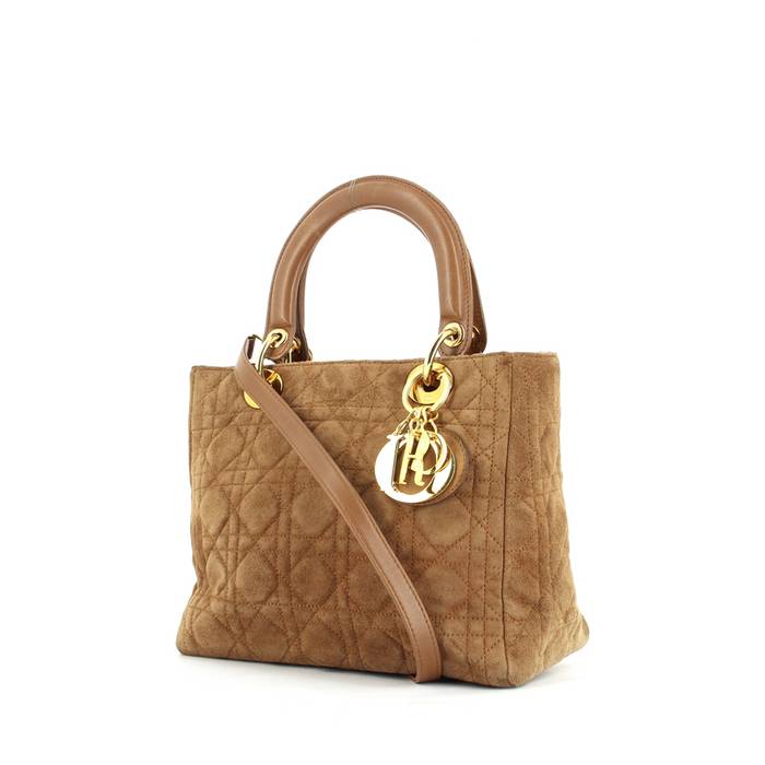 Inconfundible bolso de mano "Lady Dior" modelo mediano de ante y de cuero marrón, adorno en metal dorado, doble asa de cuero marrón, bandolera extraíble de cuero marrón para llevar en la mano o al hombro.