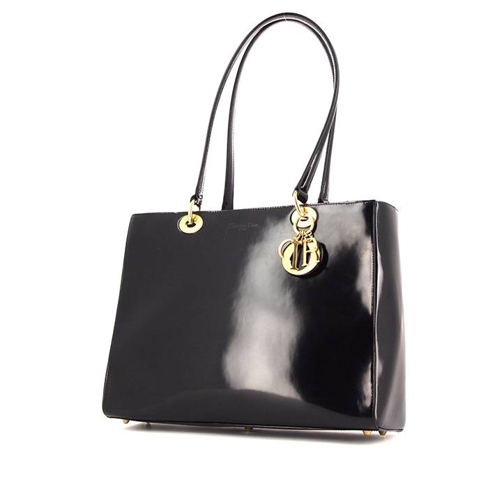 Elegante bolso para llevar al hombro Dior Lady Dior de cuero esmaltado negro, adorno en metal dorado, doble asa de cuero negro para llevar en la mano o al hombro.