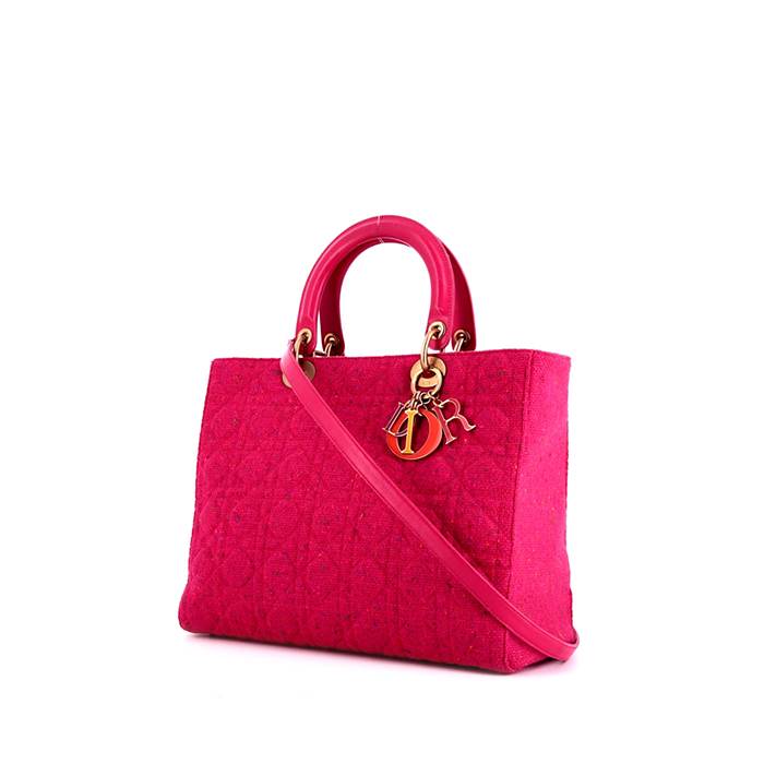 Bonito bolso para llevar al hombro o en la mano Dior Lady Dior modelo grande de tweed rosa cannage y de cuero rosa, adorno en metal dorado, doble asa de cuero rosa, bandolera extraíble de cuero rosa para llevar en la mano o al hombro.