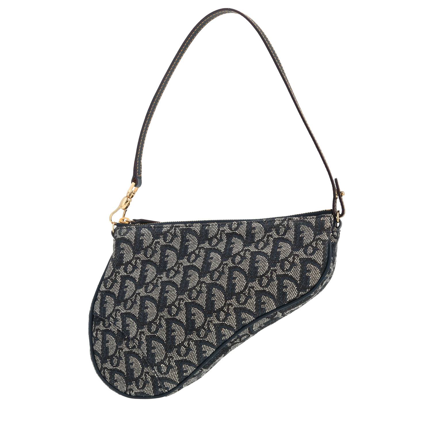Inconfundible bolso/bolsito Dior Saddle de lona Monogram Oblique azul y gris y cuero azul marino, adorno en metal dorado, asa sencilla de cuero azul marino para llevar en la mano o al hombro.