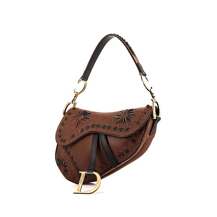 Encantador bolso de mano Dior Saddle de cuero dos tonos color caramelo y marrón oscuro de diseño floral, adorno en metal dorado, asa sencilla y cuero marrón para llevar en la mano o al hombro.