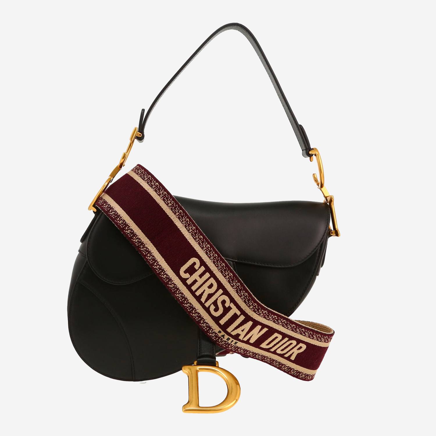 Espléndido bolso de mano Dior Saddle de cuero negro, adorno en metal dorado, una asa de cuero negro para llevar en la mano o al hombro.