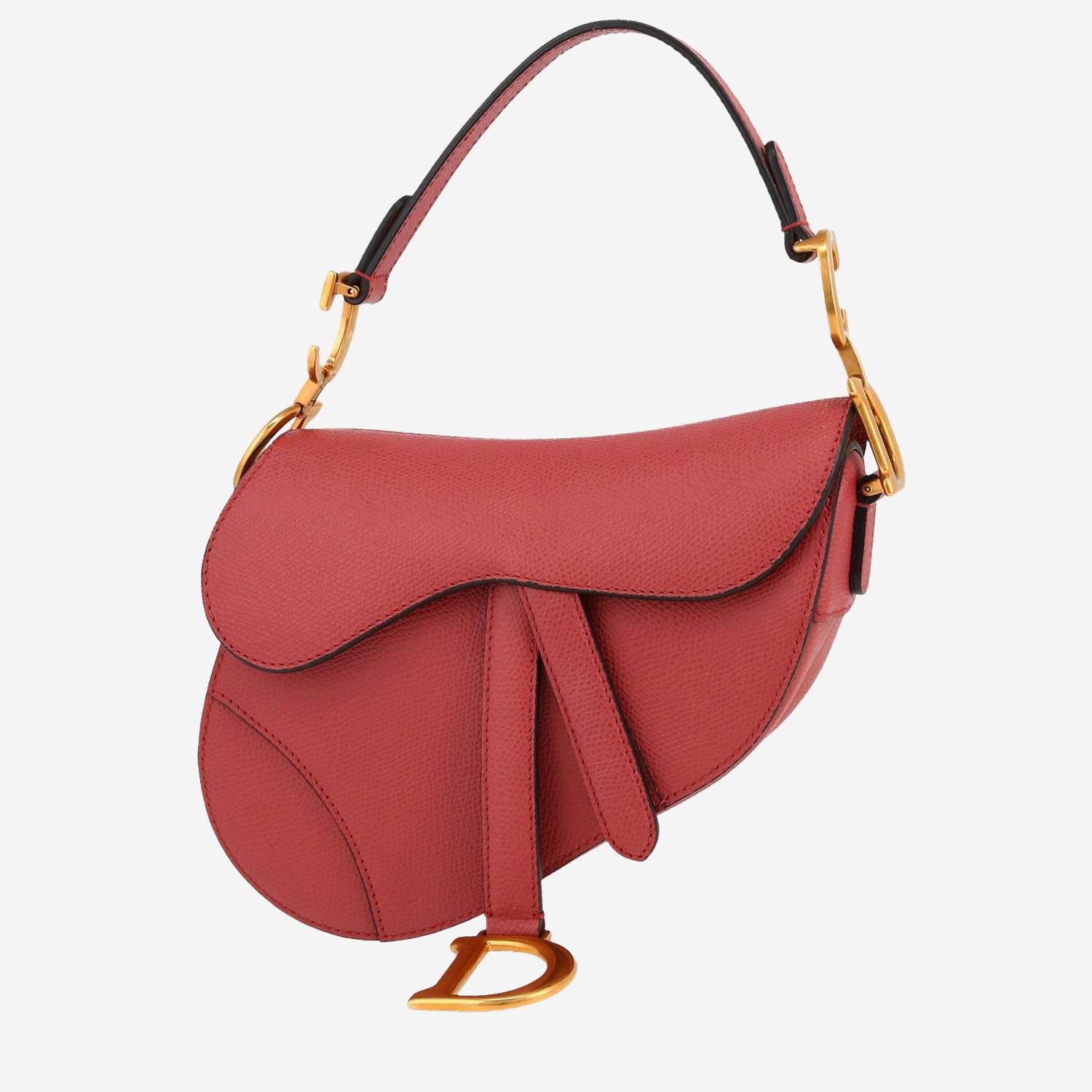 Bonito bolso de mano Dior Saddle modelo pequeño de cuero granulado rosa, adorno en metal dorado, asa sencilla de cuero rosa para llevar en la mano o al hombro.