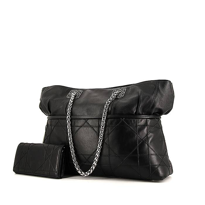 Elegante bolso de mano Dior So Dior de cuero cannage negro, adorno en metal plateado, doble asa de metal plateado para llevar en la mano o al hombro.