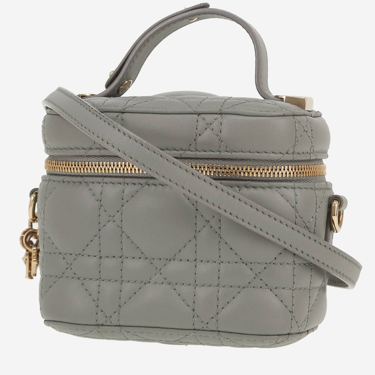 Magnífico bolso bandolera Dior Travel Vanity de cuero cannage gris, adorno en metal dorado, asa sencilla de cuero gris, bandolera extraíble y ajustable de cuero gris para llevar en la mano o colgado al hombro o cruzado.
