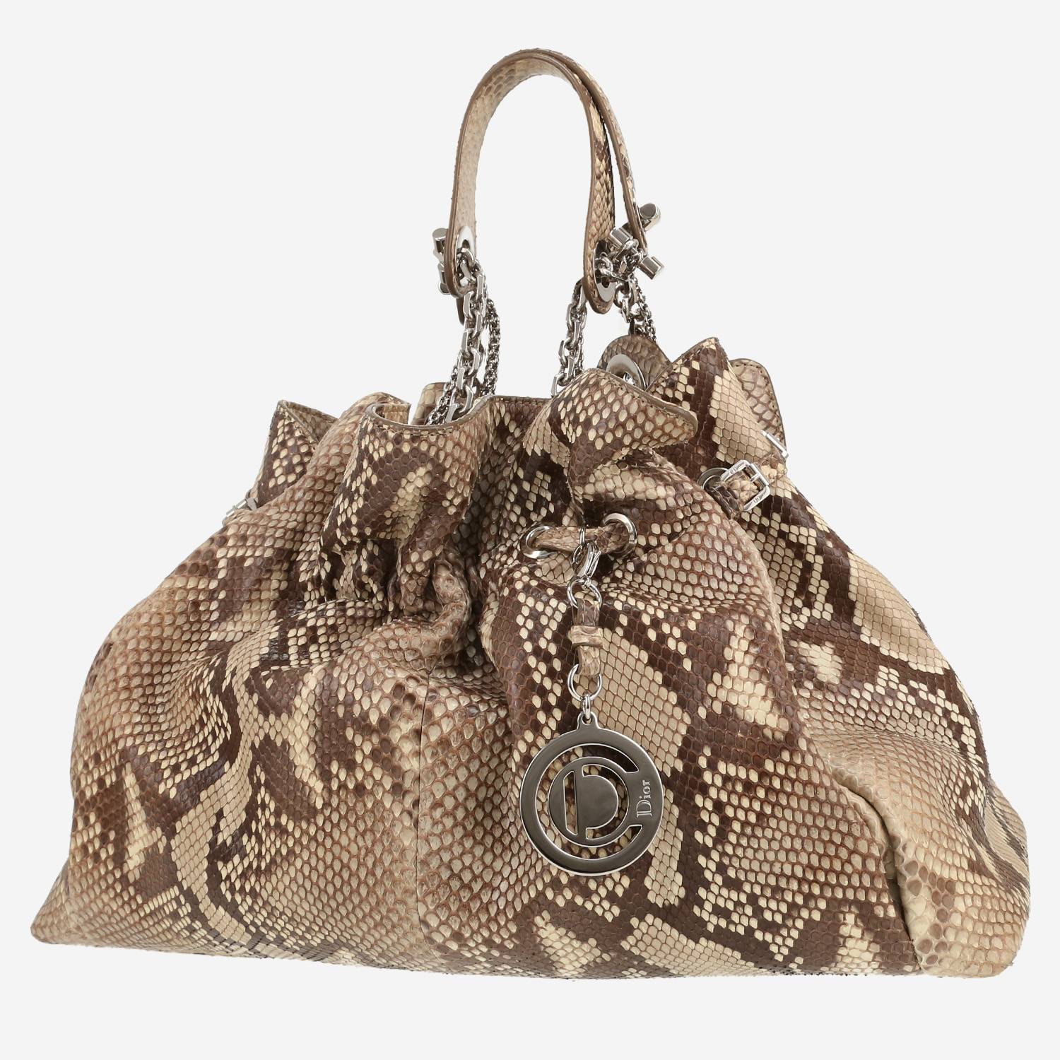 Magnífico bolso de mano Dior Trente de piel de pitón marrón y beige, adorno en metal plateado, doble asa de metal plateado para llevar en la mano o al hombro.