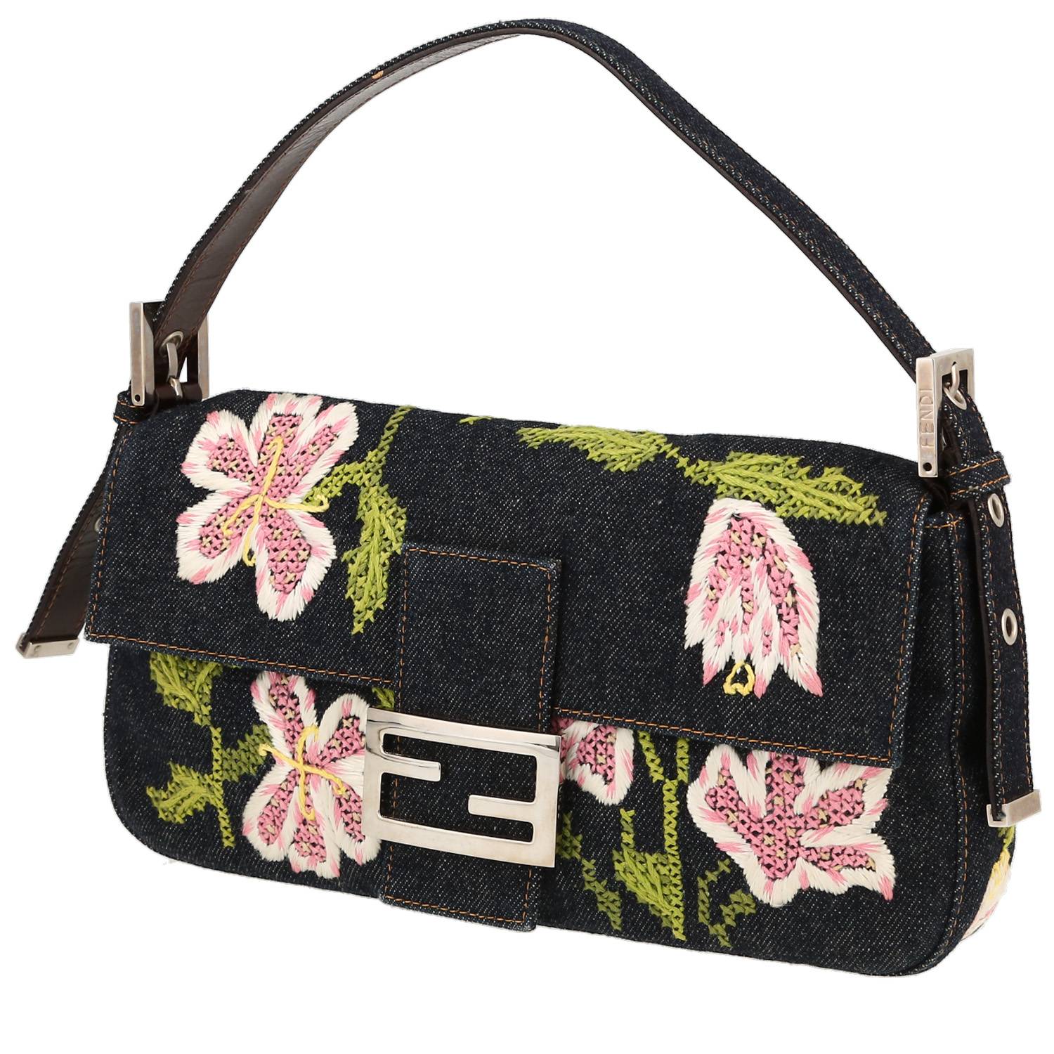 Inconfundible bolso de mano Fendi Baguette de denim azul de diseño floral, adorno en metal plateado, una asa de denim azul para llevar en la mano o al hombro.