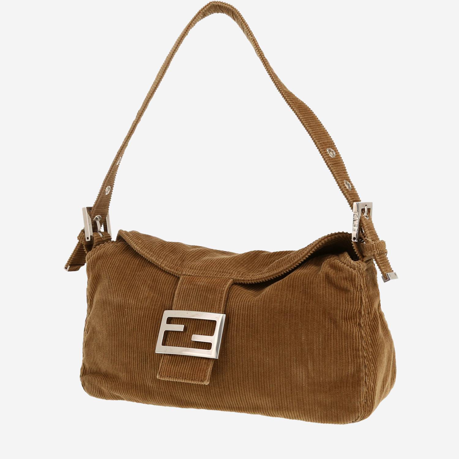 Inconfundible bolso de mano Fendi Baguette de terciopelo marrón, adorno en metal plateado, una asa ajustable de terciopelo marrón para llevar en la mano o al hombro.
