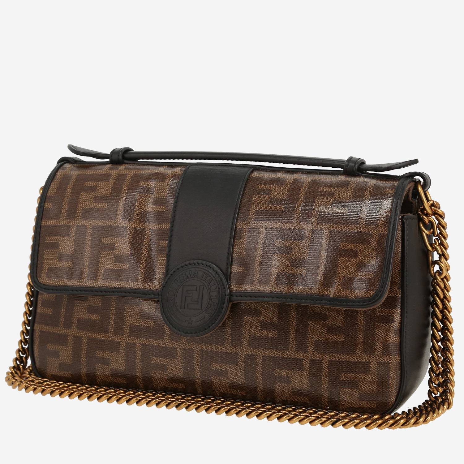 Divertido bolso bandolera Fendi de cuero negro y lona monogram marrón, adorno en metal dorado, asa sencilla de cuero negro, una asa en cadena de metal dorado para llevar en la mano o colgado al hombro o cruzado.