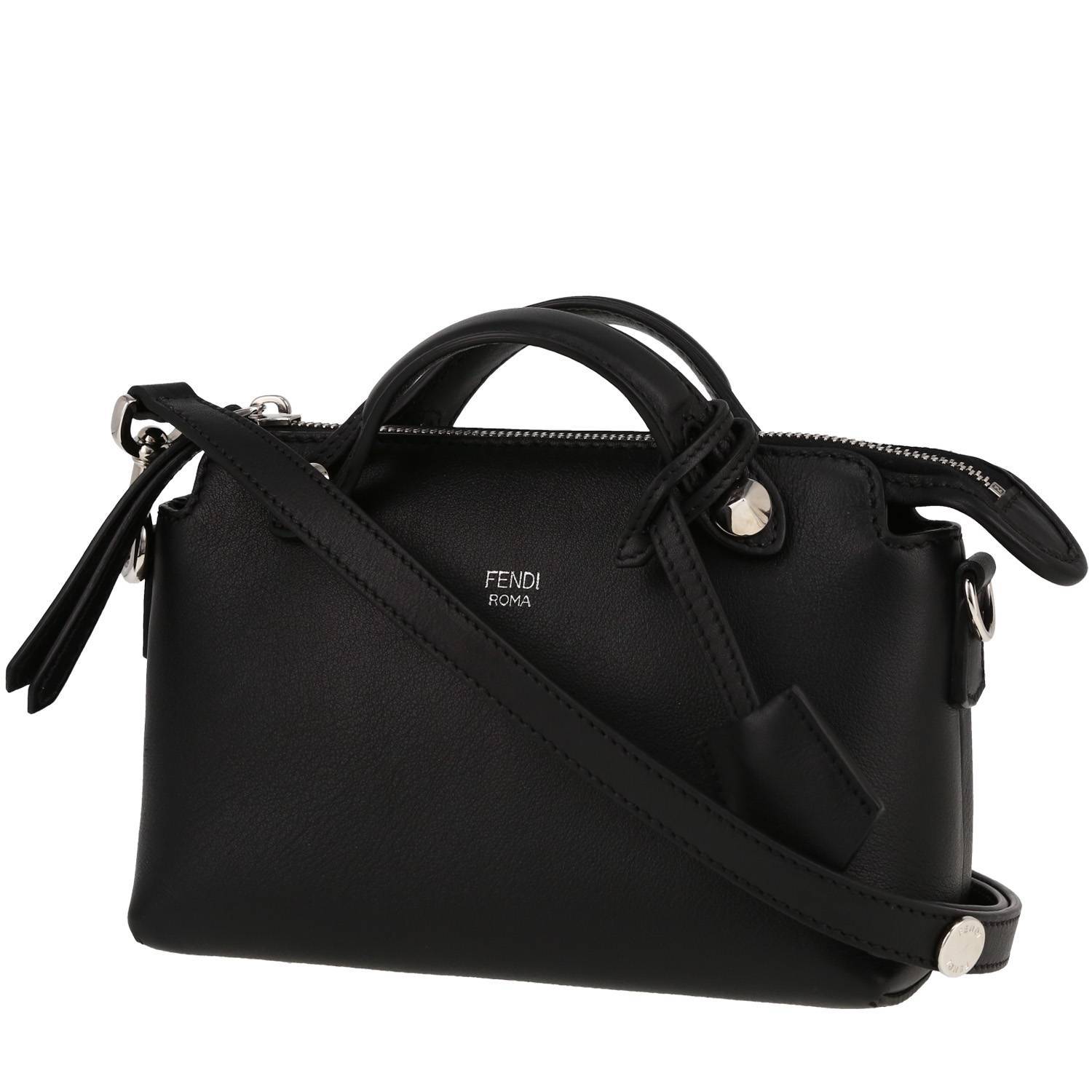 Magnífico bolso de mano Fendi By the way mini de cuero negro, adorno en metal plateado, doble asa de cuero negro, una, bandolera extraíble y ajustable de cuero negro para llevar en la mano o colgado al hombro o cruzado.