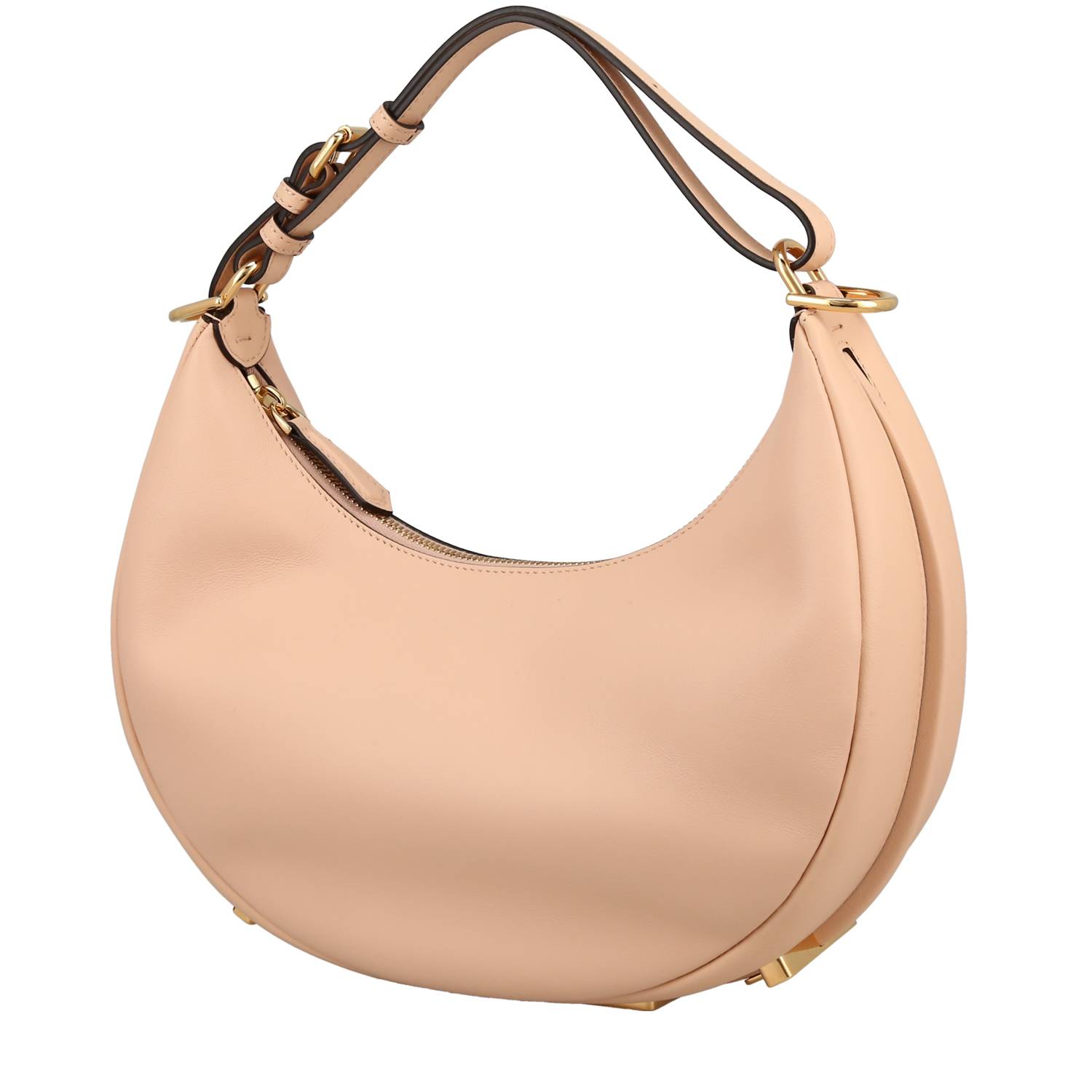 Elegante bolso de mano Fendi Fendigraphy y cuero liso rosa, adorno en metal dorado, asa sencilla ajustable de cuero rosa para llevar en la mano o al hombro.