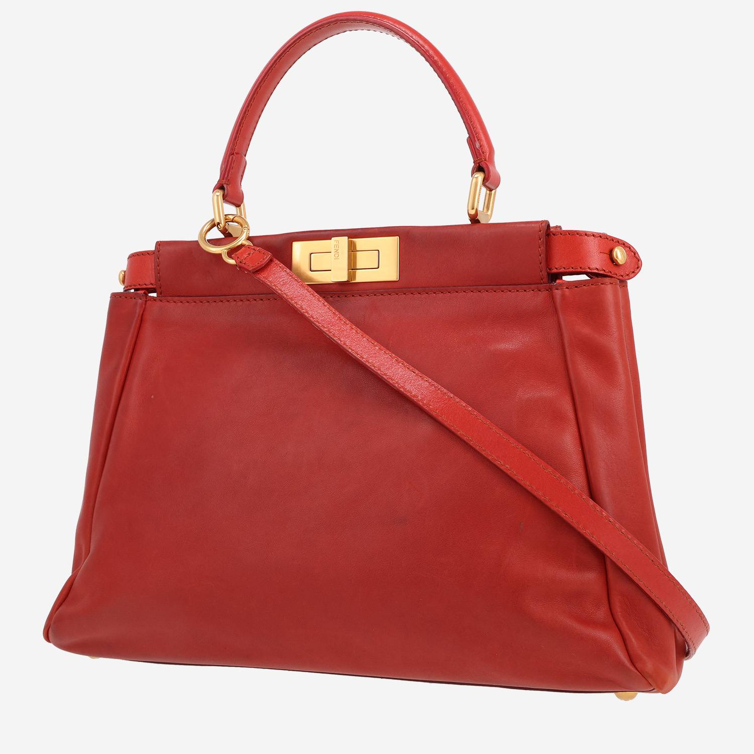 Magnífico bolso de mano Fendi Peekaboo de cuero rojo, adorno en metal dorado, asa de cuero rojo, bandolera extraíble y ajustable de cuero rojo para llevar en la mano o colgado al hombro o cruzado.