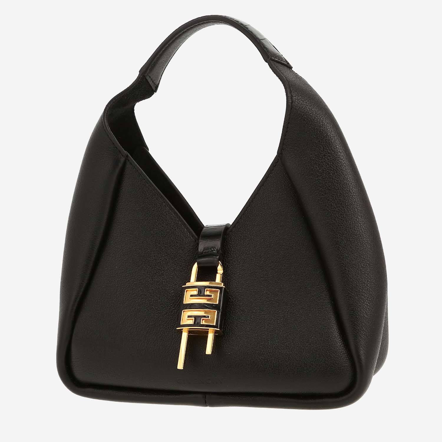 Elegante bolso de mano Givenchy G-Lock de cuero negro, adorno en metal dorado, asa sencilla de cuero negro para llevar en la mano o al hombro.