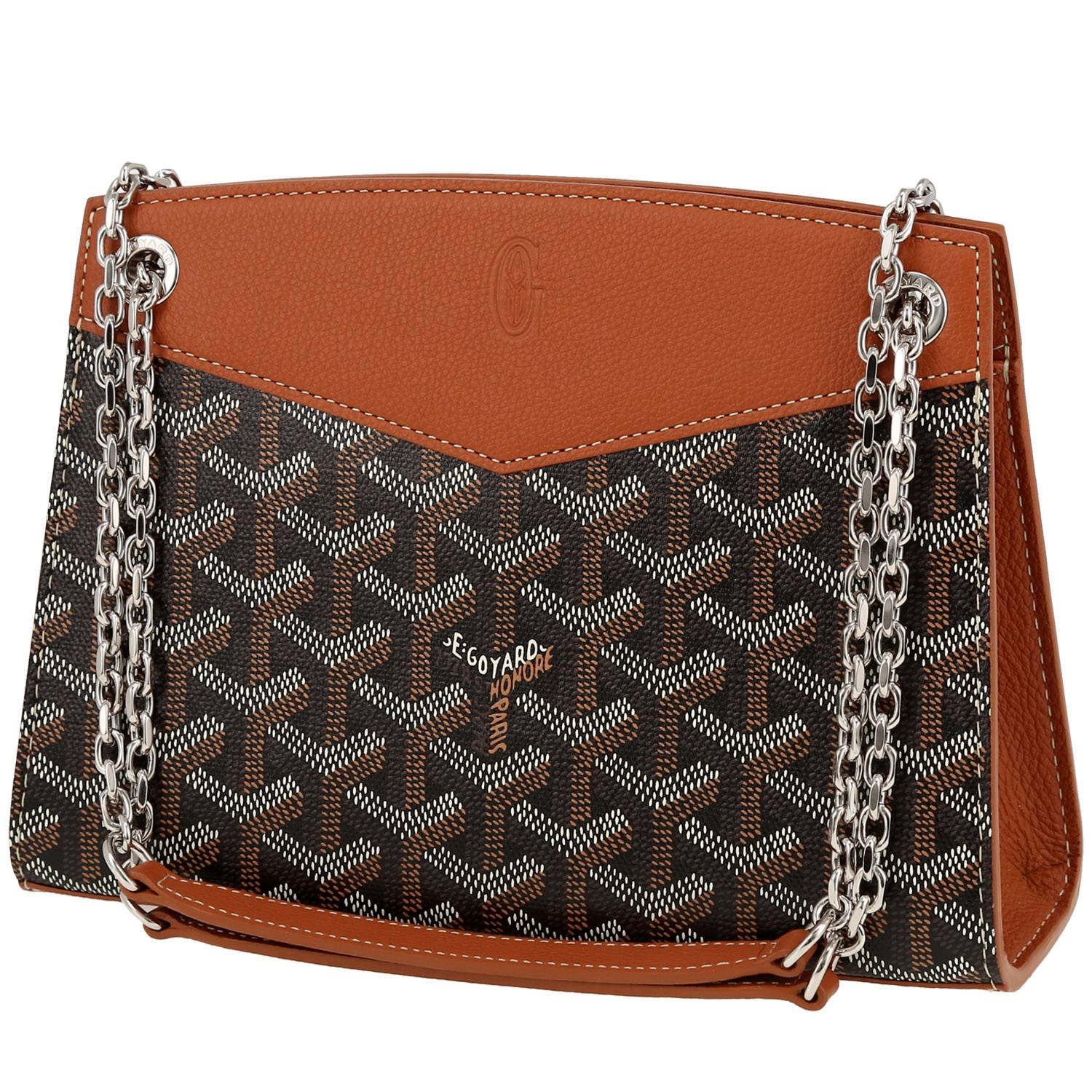Magnífico bolso de mano Goyard Rouette de tela Goyardine marrón y cuero marrón, adorno en metal plateado, una asa en cadena ajustable de metal plateado para llevar en la mano o colgado al hombro o cruzado.