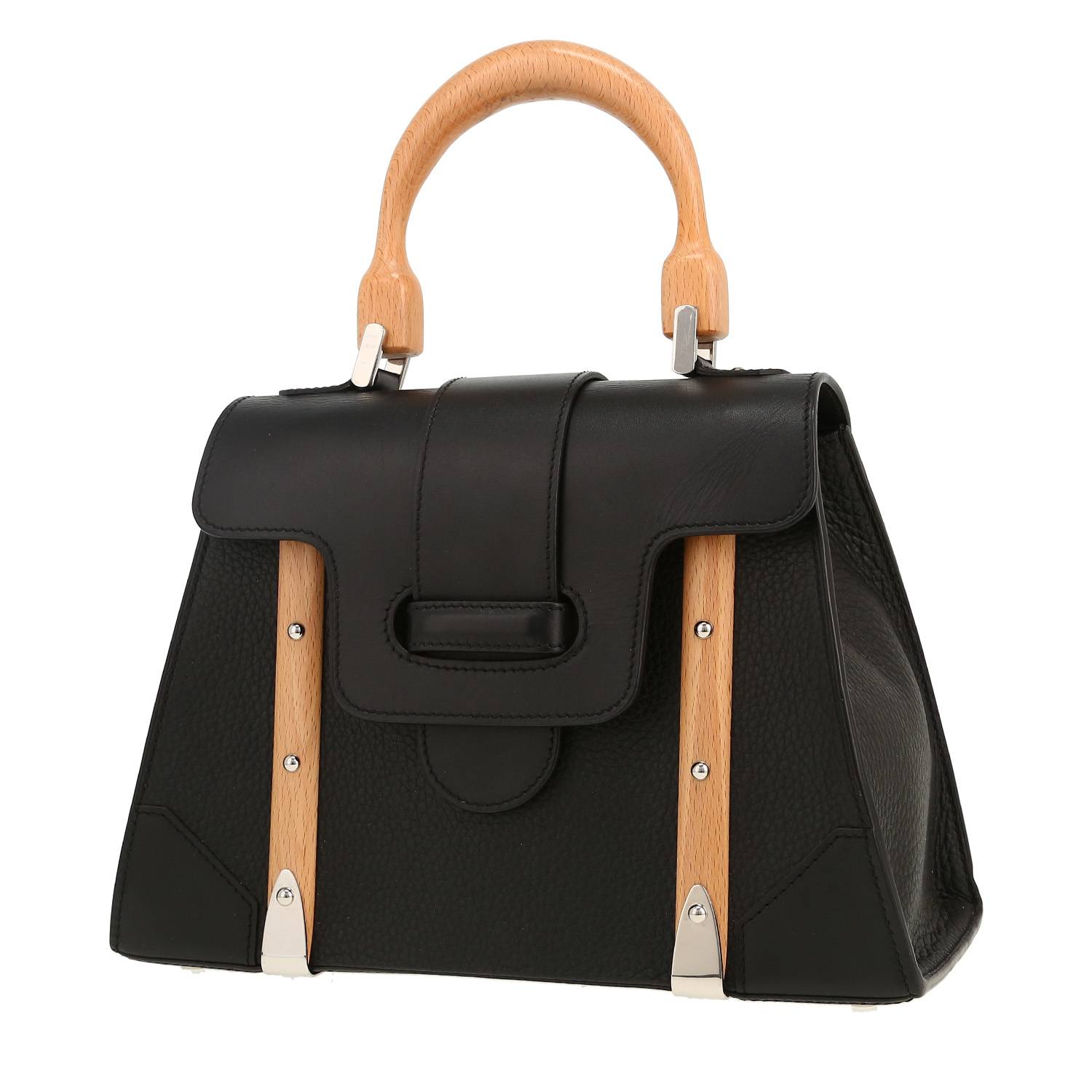 Magnífico bolso de mano Goyard Saigon de cuero granulado negro, adorno en metal plateado, asa de madera para llevar en la mano.