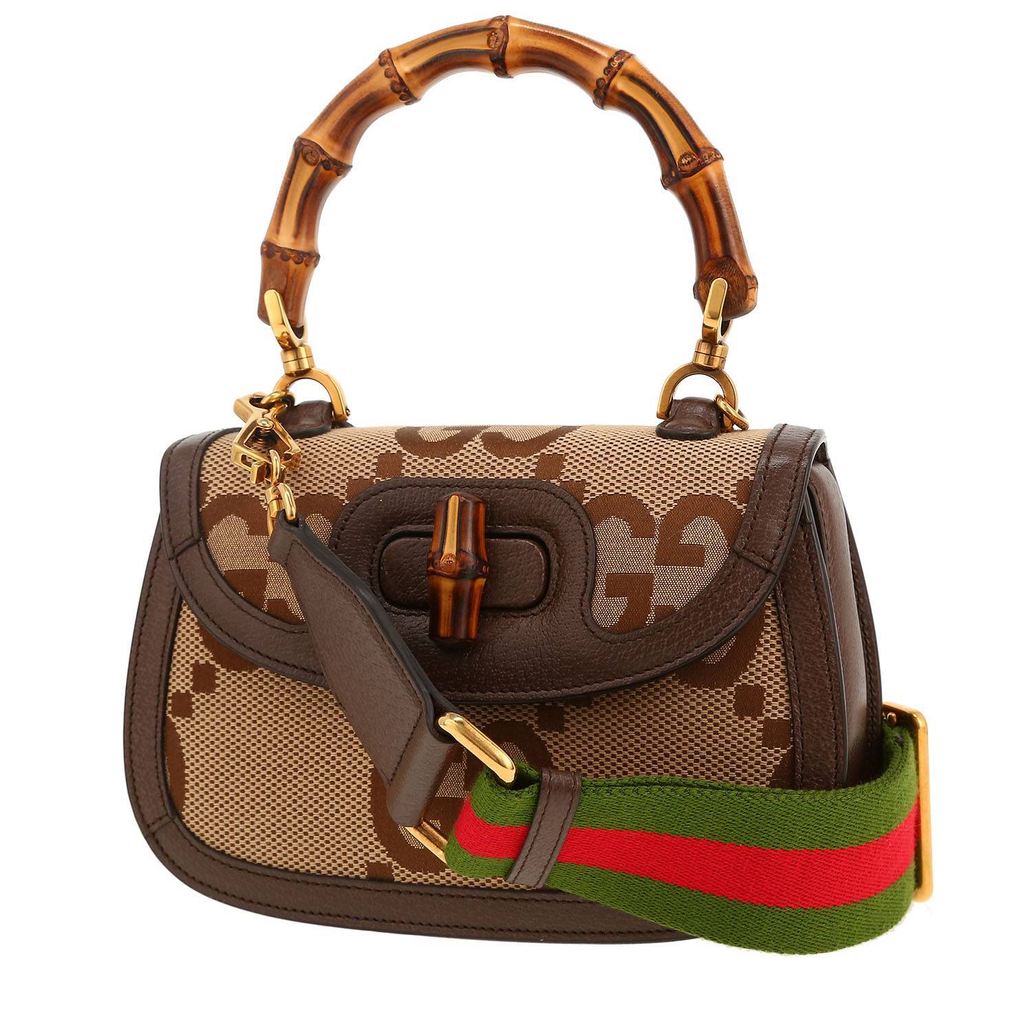 Magnífico bolso bandolera Gucci Bamboo modelo pequeño de lona monogram beige y marrón y cuero marrón, adorno en metal dorado, asa sencilla de bambú, una bandolera extraíble de cuero marrón, bandolera extraíble de lona para llevar en la mano o colgado al hombro o cruzado.