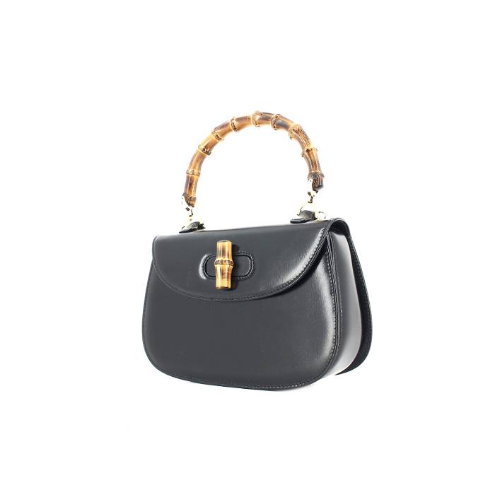 Encantador bolso de mano "Bamboo" de charol negro, asa sencilla de bambú para llevar en la mano. Cierre con pestillo giratorio en la solapa. Forro interior de cuero rojo, un bolsillo plano con cierre de botón a presión, un bolsillo con cremallera, un bolsillo plano. Se vende con espejo de bolsillo. Firma : "Gucci made in Italy". Muy buen estado : buena calidad del cuero, ligera pátina del cuero.