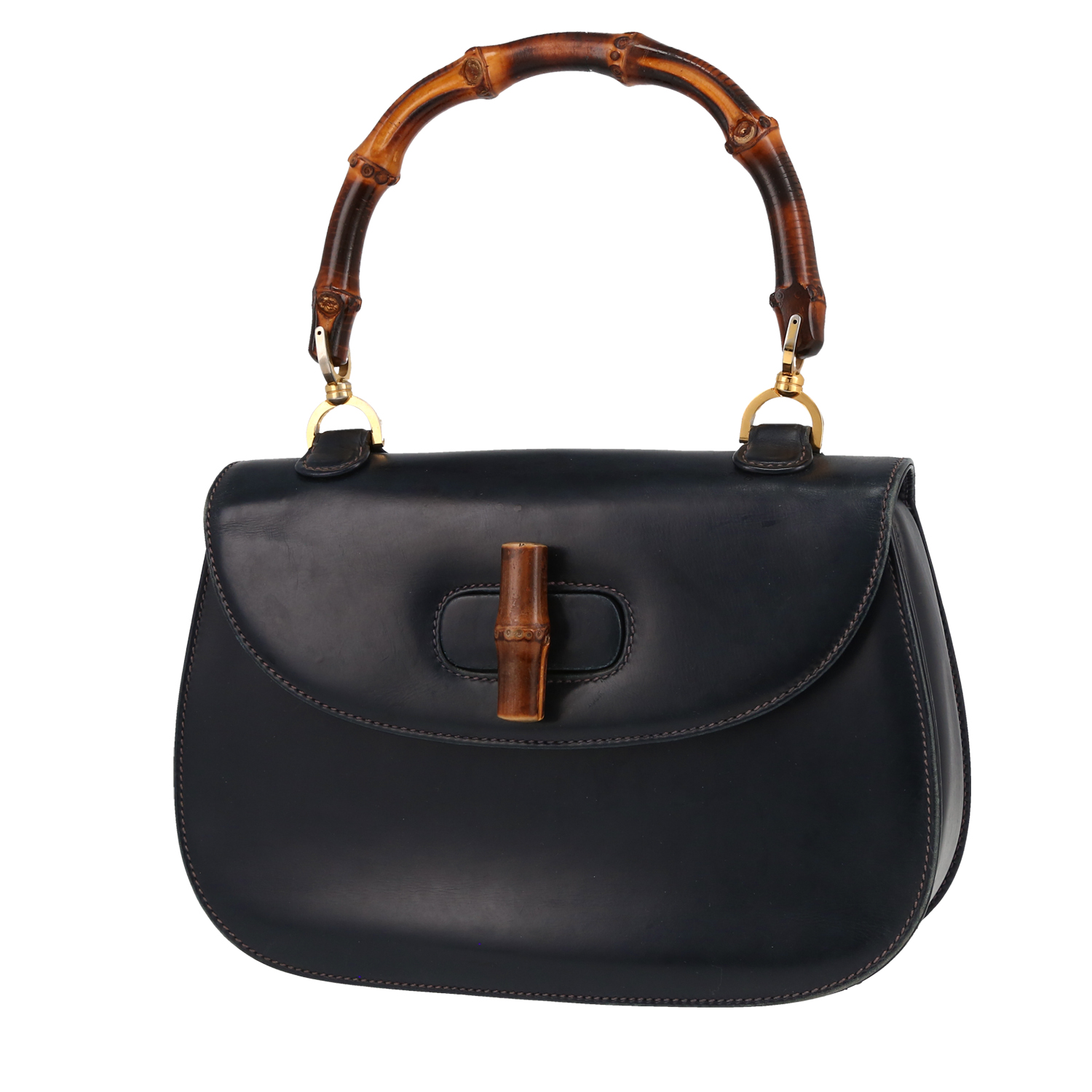 Bolso de mano Gucci Bamboo de cuero azul y bambú, adorno en metal plateado, asa sencilla de bambú para llevar en la mano.