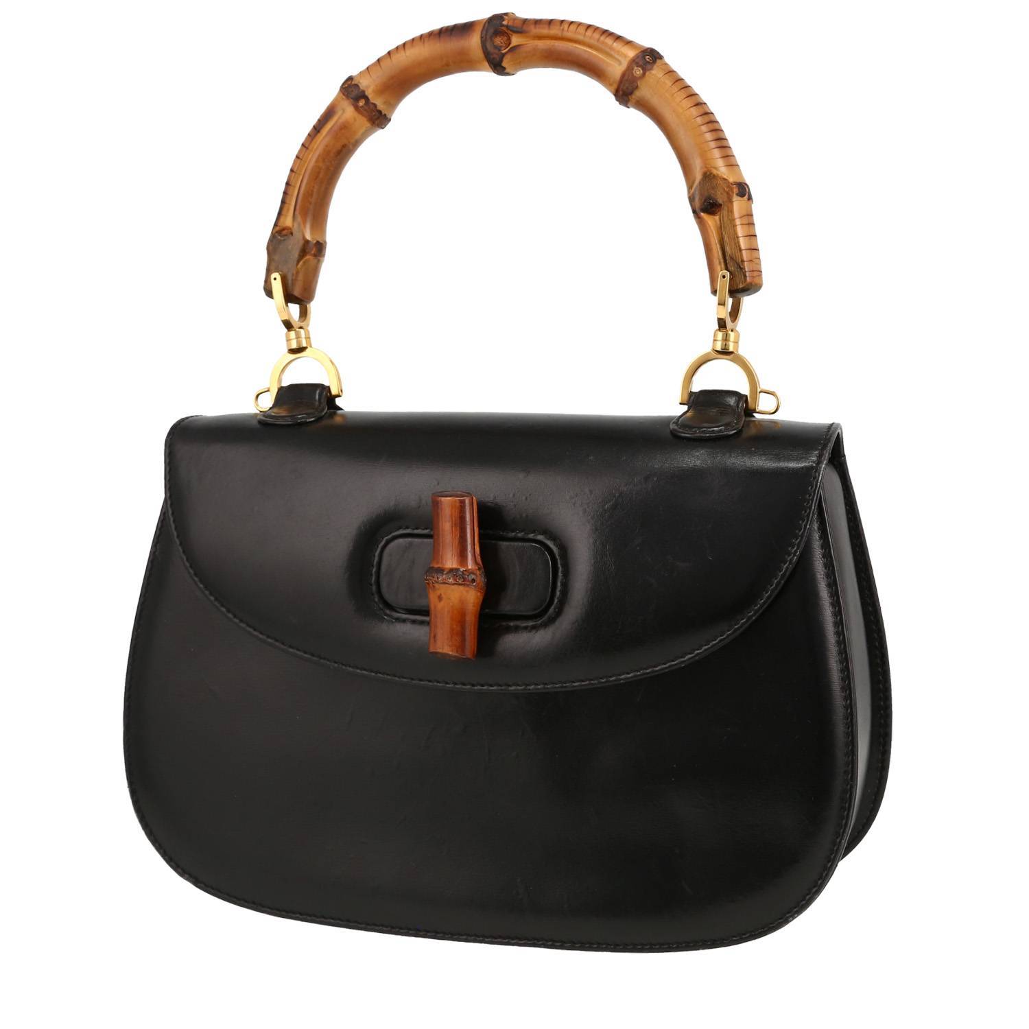 Magnífico bolso de mano Gucci Bamboo de cuero negro y bambú, adorno en metal dorado, asa sencilla de bambú para llevar en la mano.