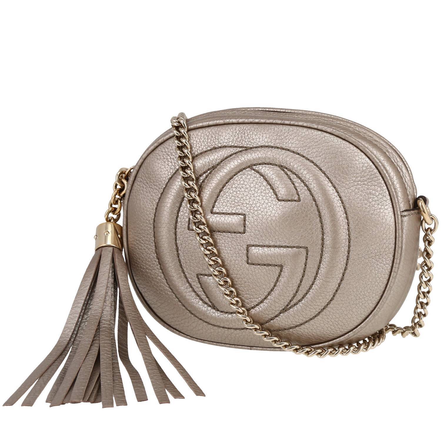 Divertido bolso bandolera Gucci Blondie de cuero dorado, adorno en metal dorado, una asa en cadena de metal dorado para llevar al hombro o cruzado.
