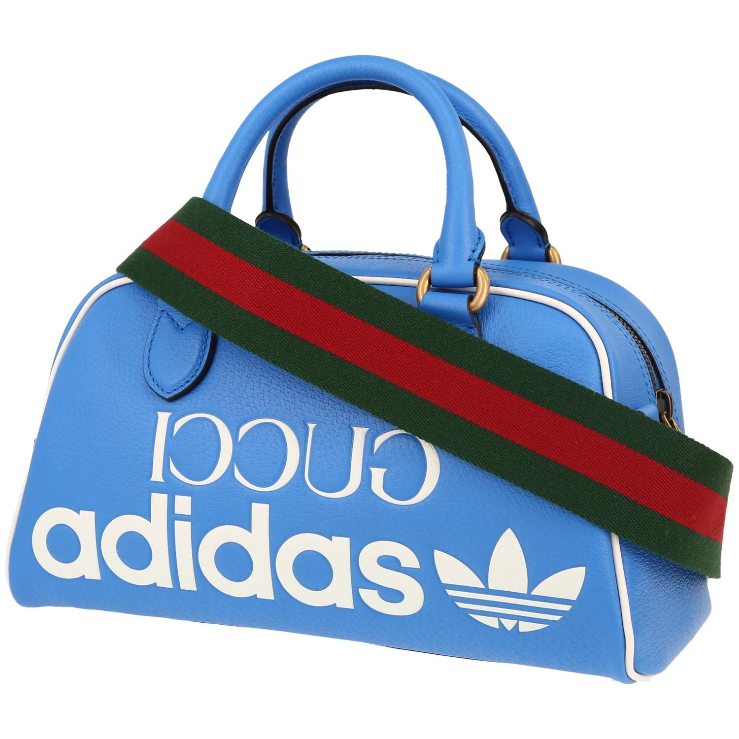 Bolso bandolera Gucci de cuero azul y blanco, adorno en metal dorado, doble asa de cuero azul, una bandolera ajustable de lona roja para llevar en la mano o colgado al hombro o cruzado.