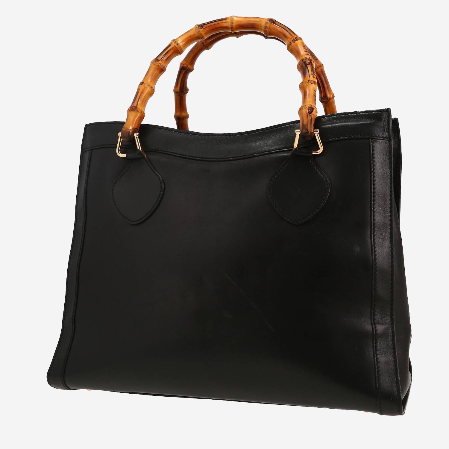 Bonito bolso de mano Gucci Diana de cuero negro, adorno en metal dorado, doble asa de bambú marrón para llevar en la mano.