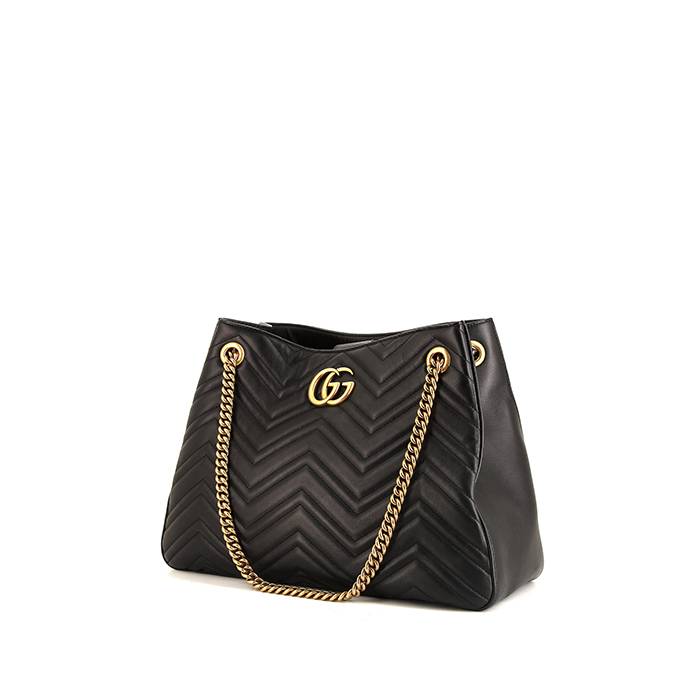 Bolso bandolera Gucci GG Marmont de cuero acolchado negro con diseños geométricos, adorno en metal dorado, asa de metal dorado para llevar al hombro o cruzado.