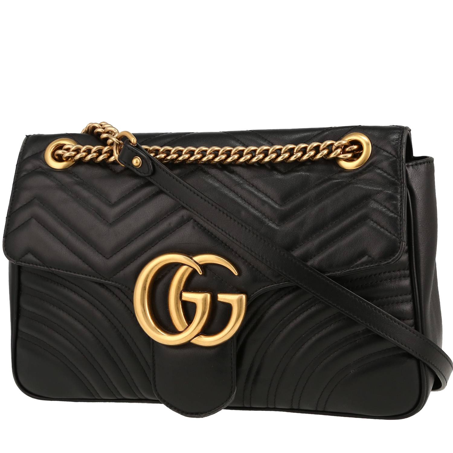 Magnífico bolso bandolera Gucci GG Marmont de cuero acolchado negro con diseños geométricos, adorno en metal dorado, una asa en cadena ajustable de metal dorado para llevar al hombro o cruzado.