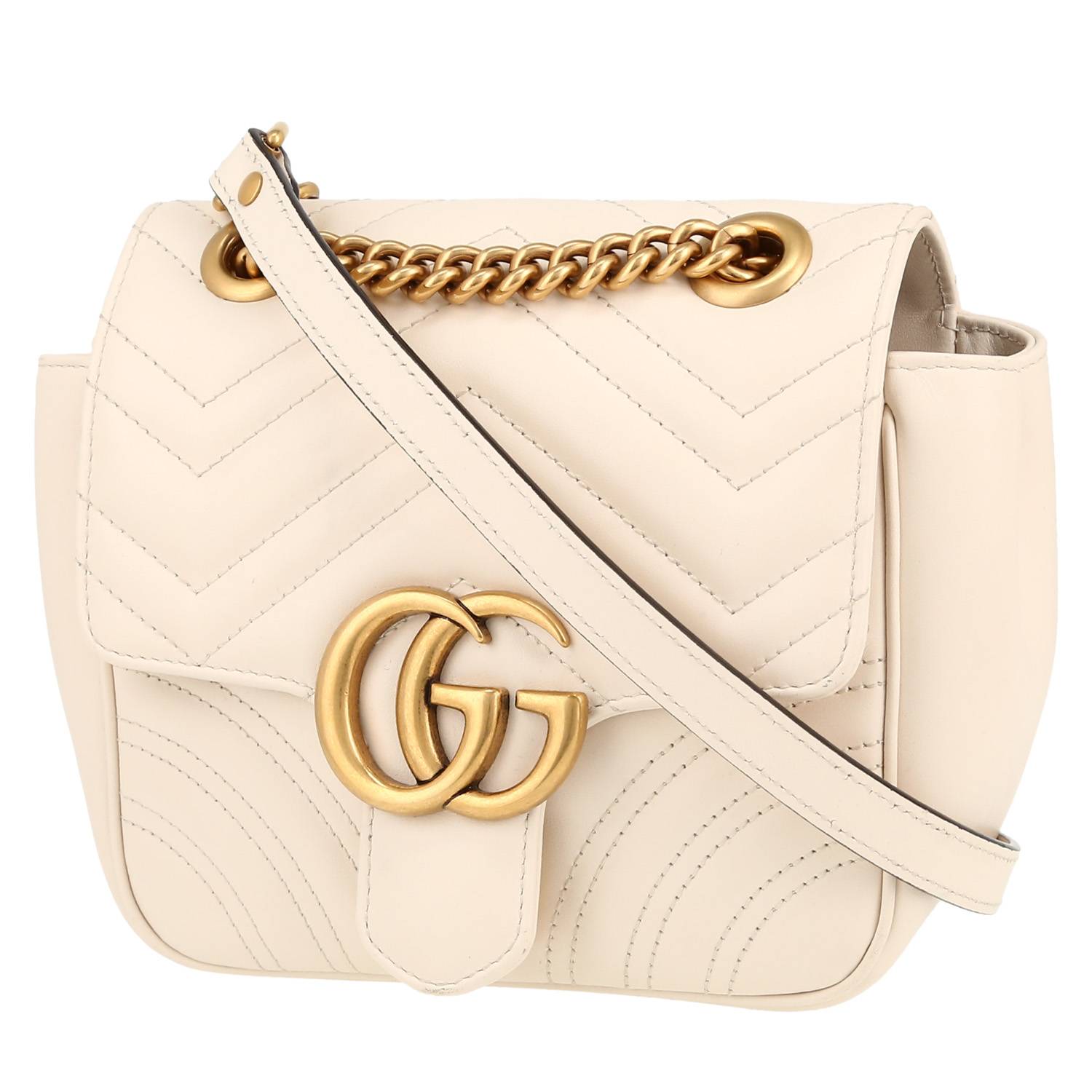 Encantador bolso bandolera Gucci GG Marmont modelo pequeño de cuero acolchado beige, adorno en metal dorado, doble asa en cadena ajustable de metal dorado para llevar al hombro o cruzado.