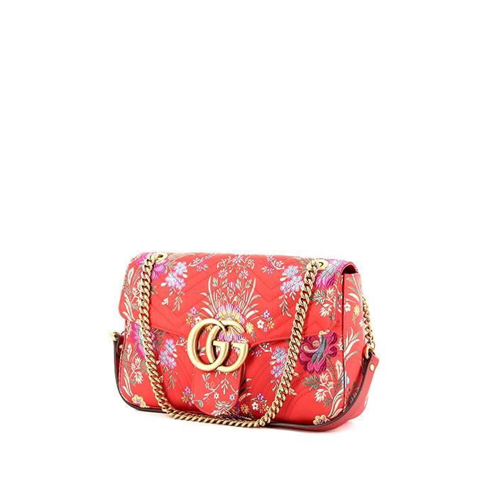 Sorprendente bolso de mano Gucci GG Marmont de satén rojo de diseño floral, adorno en metal dorado, doble asa en cadena de metal dorado para llevar al hombro o cruzado.
