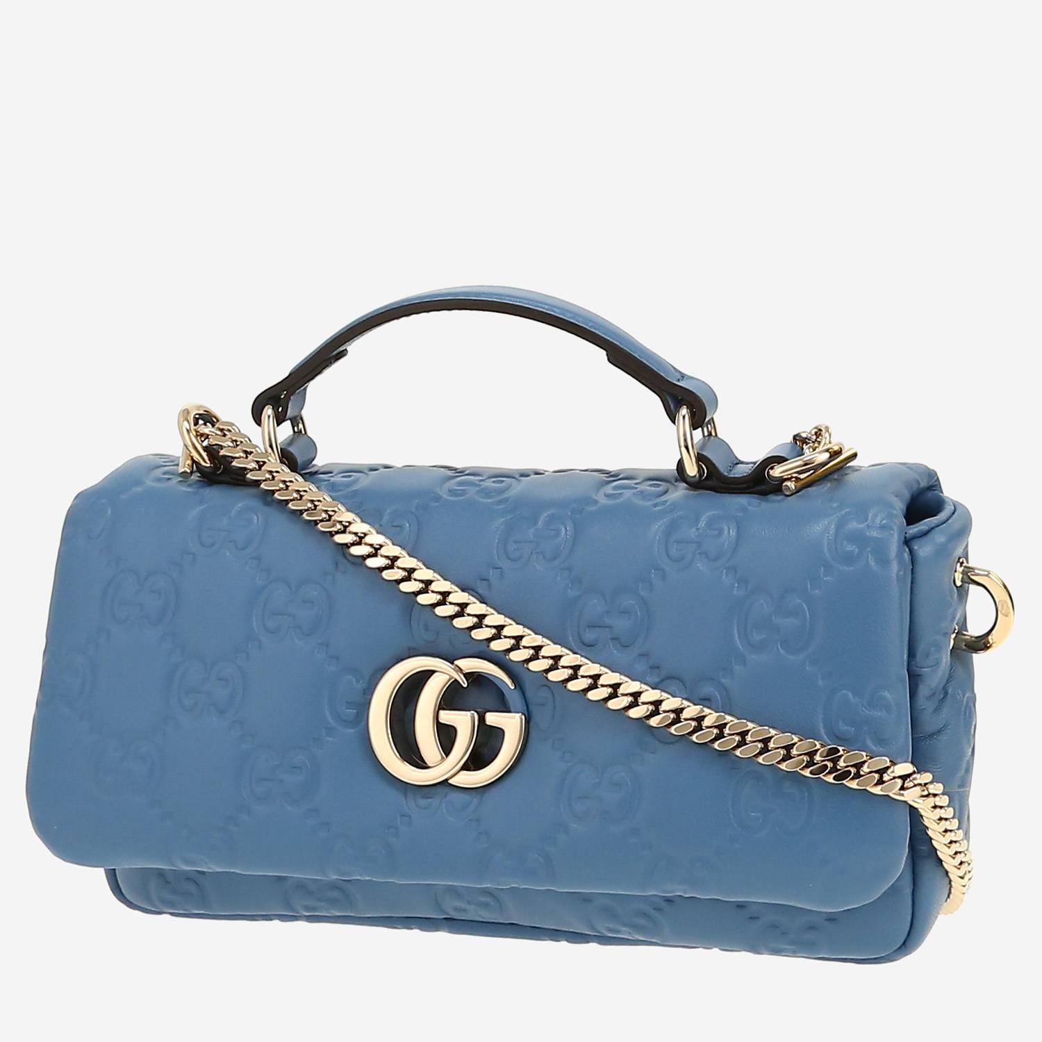 Bonito bolso bandolera Gucci GG Milano de cuero azul, adorno en metal dorado, asa sencilla de cuero azul, una asa en cadena de metal dorado para llevar en la mano o colgado al hombro o cruzado.