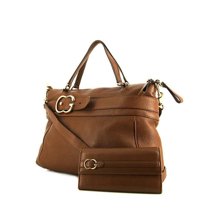 Encantador bolso de mano Gucci GG running de cuero granulado marrón, adorno en metal dorado, doble asa de cuero granulado marrón, una bandolera extraíble de cuero granulado marrón para llevar en la mano o al hombro.