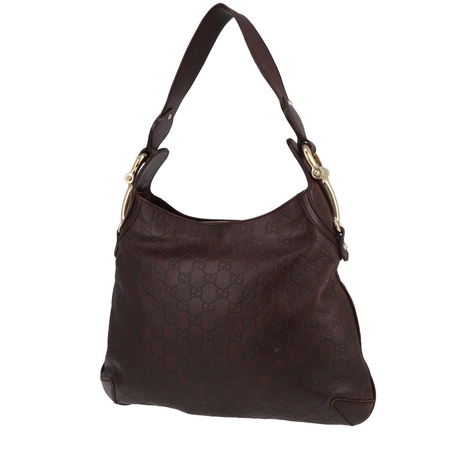 Práctico bolso de mano Gucci Guccissima de cuero marrón estampa de firma, adorno en metal dorado, una asa de cuero marrón para llevar en la mano o al hombro.