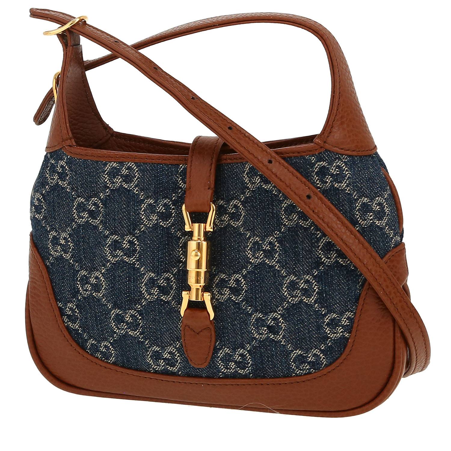 Magnífico bolso bandolera Gucci Jackie mini de lona denim Monogram azul y cuero marrón, adorno en metal dorado, una asa ajustable de cuero marrón para llevar en la mano o colgado al hombro o cruzado.