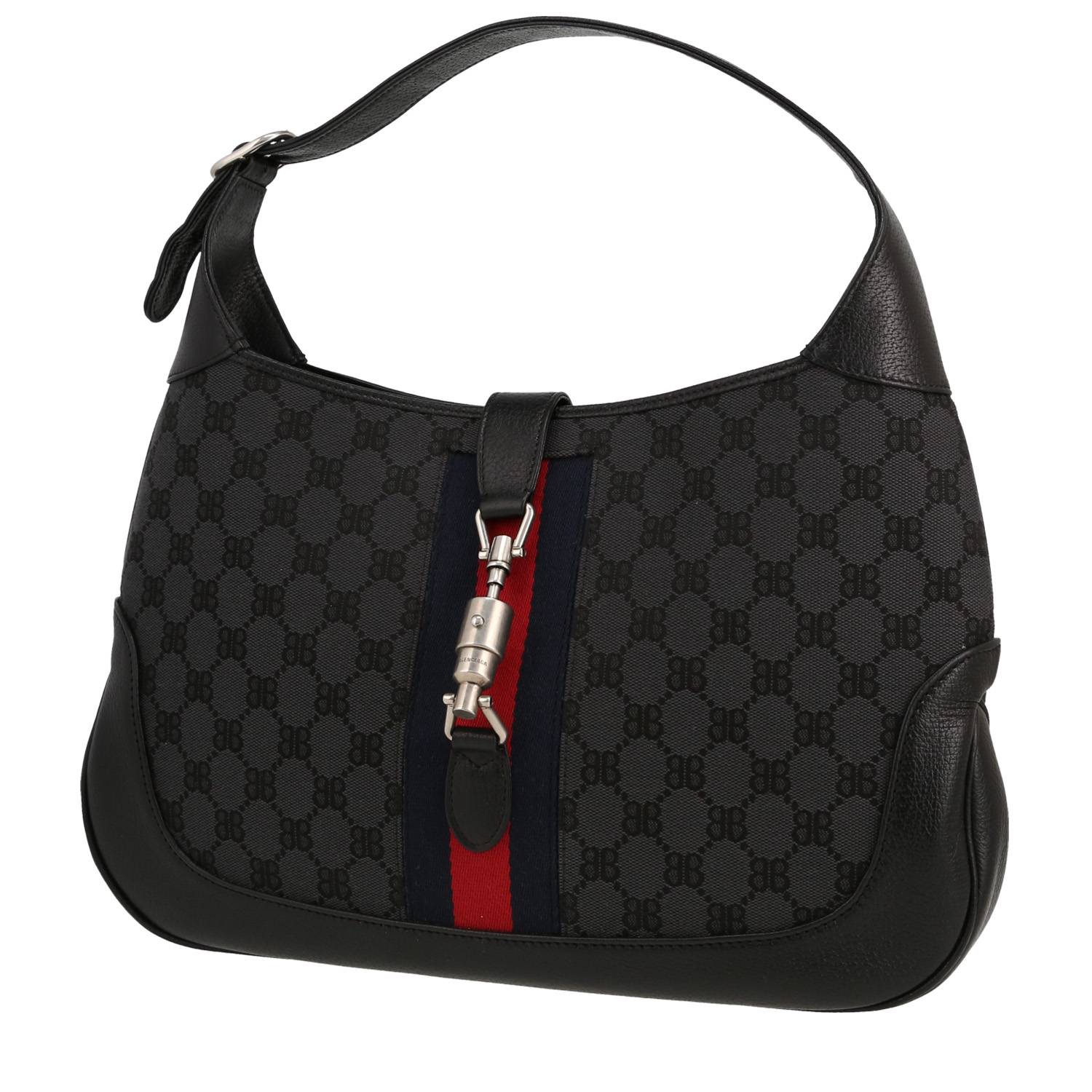 Bonito y codiciado bolso de mano Balenciaga x Gucci Jackie de lona Monogram gris y cuero negro, adorno en metal plateado, una asa ajustable de cuero negro para llevar al hombro o cruzado.