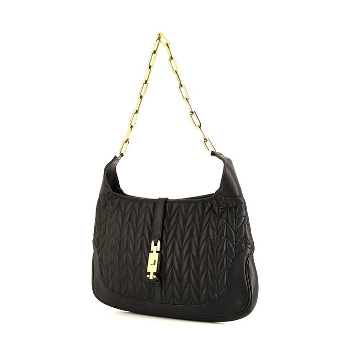 Elegante bolso de mano Gucci Jackie de cuero acolchado negro, adorno en metal dorado, una asa en cadena de metal dorado para llevar en la mano o al hombro.