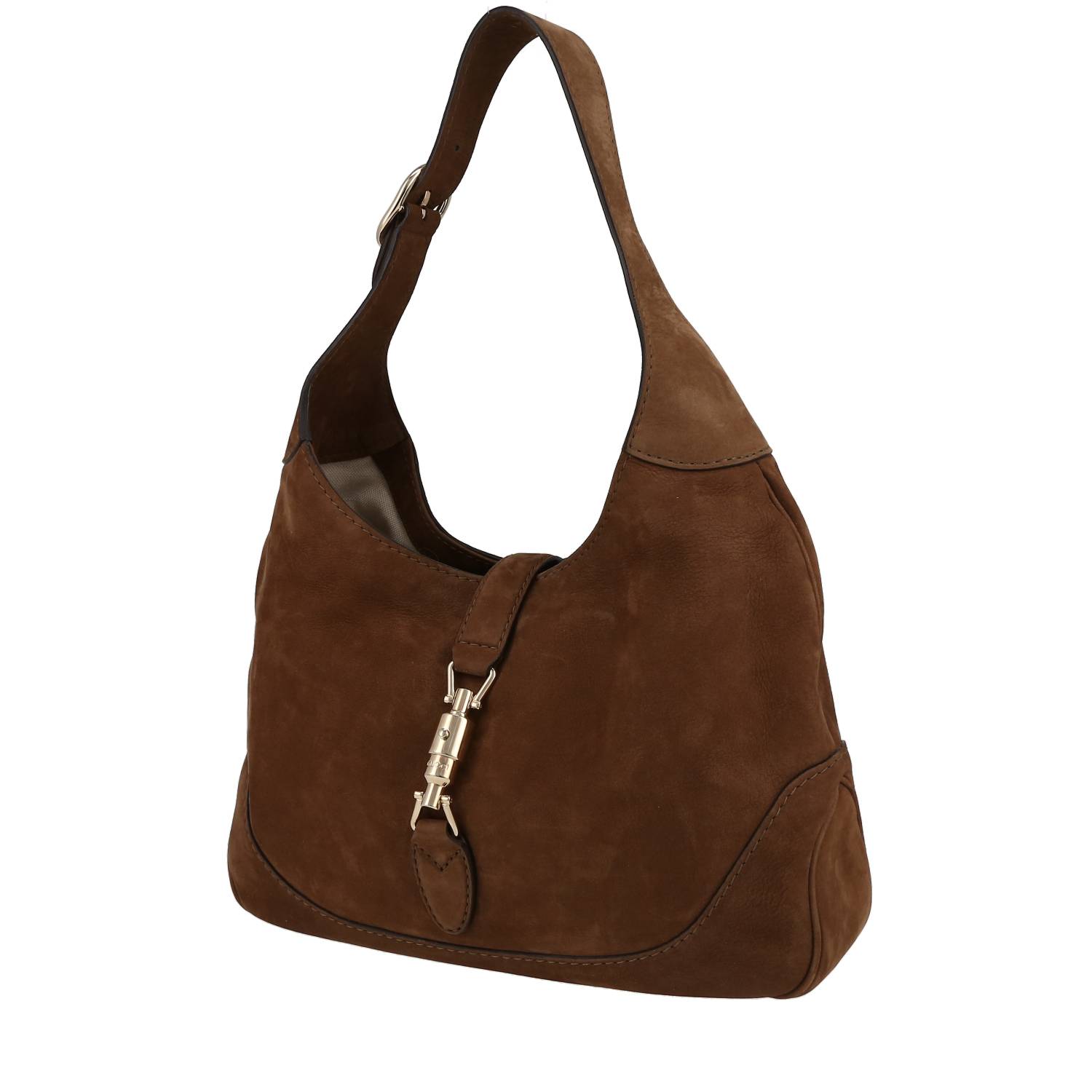 Precioso bolso de mano Gucci Jackie de cuero marrón, adorno en metal plateado, una asa ajustable de cuero marrón.