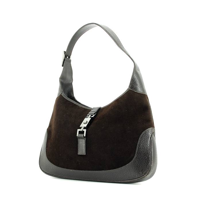 Famoso bolso de mano Gucci Jackie de fieltro de lana y de cuero marrón, adorno en metal plateado, una asa de cuero marrón para llevar en la mano o al hombro.