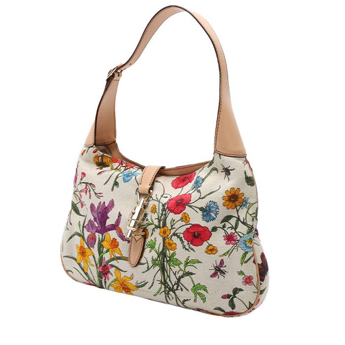 Precioso bolso de mano Gucci Jackie de lona blanco de diseño floral y cuero beige, adorno en metal dorado, una asa de cuero beige para llevar en la mano o al hombro.