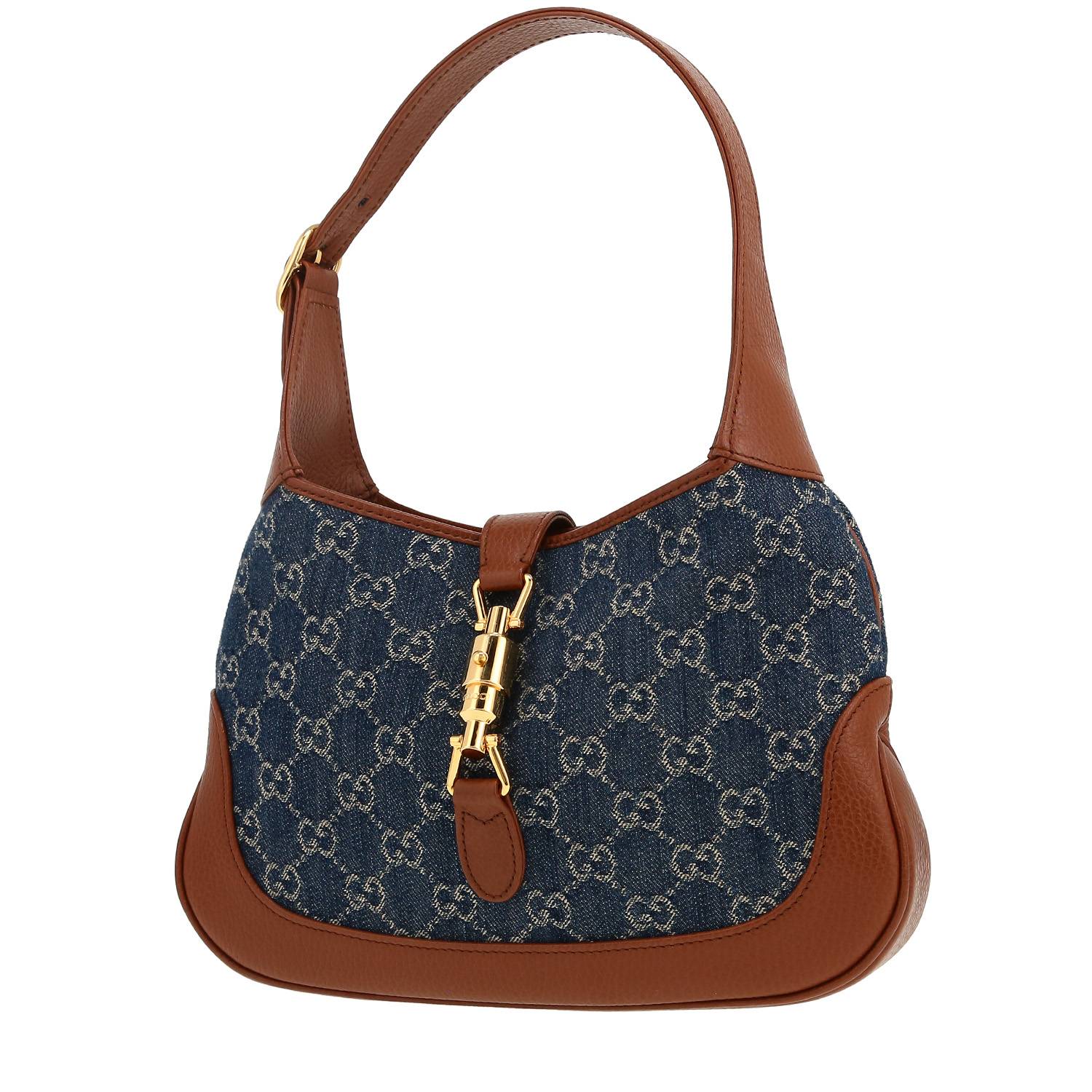 Inconfundible bolso de mano Gucci Jackie de lona denim Monogram azul y cuero marrón, adorno en metal dorado, una asa ajustable de cuero marrón para llevar en la mano o colgado al hombro o cruzado.