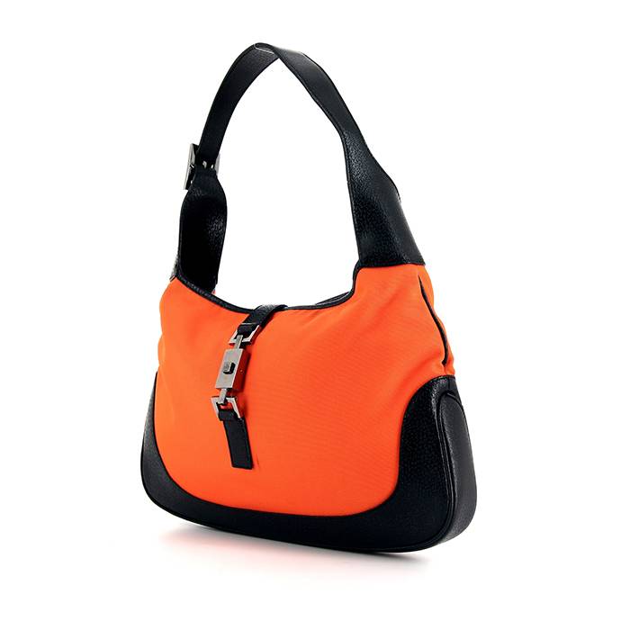Excepcional bolso de mano Gucci Jackie de lona naranja y de cuero negro, adorno en metal plateado, una asa de cuero negro para llevar en la mano o al hombro.