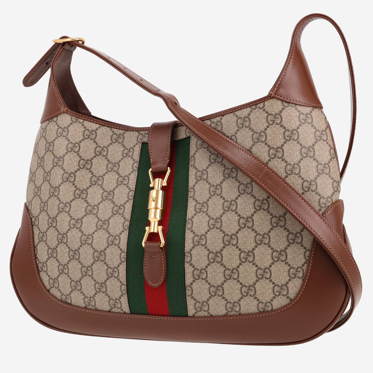 Magnífico bolso de mano Gucci Jackie modelo grande de tejido "sûpreme GG" beige y cuero marrón, adorno en metal dorado, una asa ajustable de cuero marrón para llevar en la mano o colgado al hombro o cruzado.