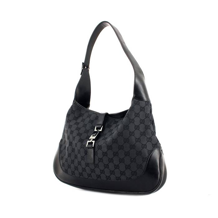 Bolso de mano "Jackie" de lona Monogram y de cuero negro, asa de cuero negro para llevar en la mano o al hombro.