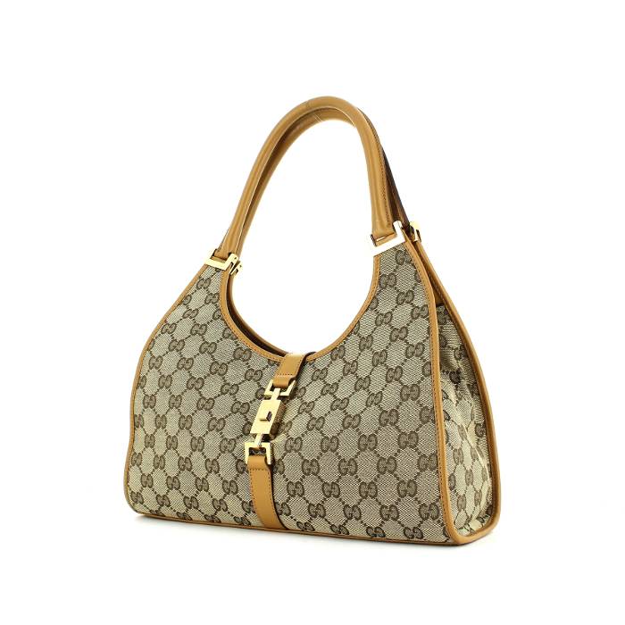 Bonito bolso de mano "Jackie" de tela Monogram y de cuero beige, doble asa de cuero beige para llevar en la mano o al hombro.