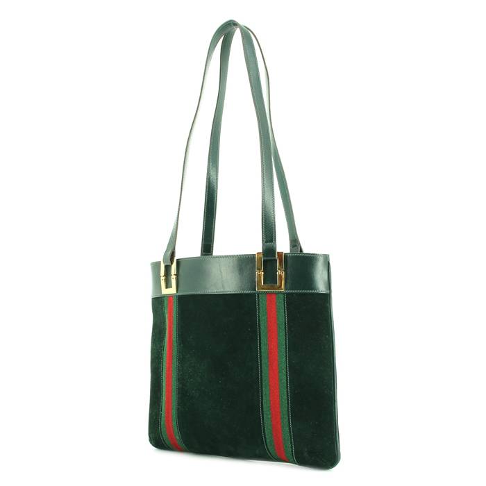 Bolso de mano de ante y de cuero verde, doble asa de cuero para llevar al hombro.