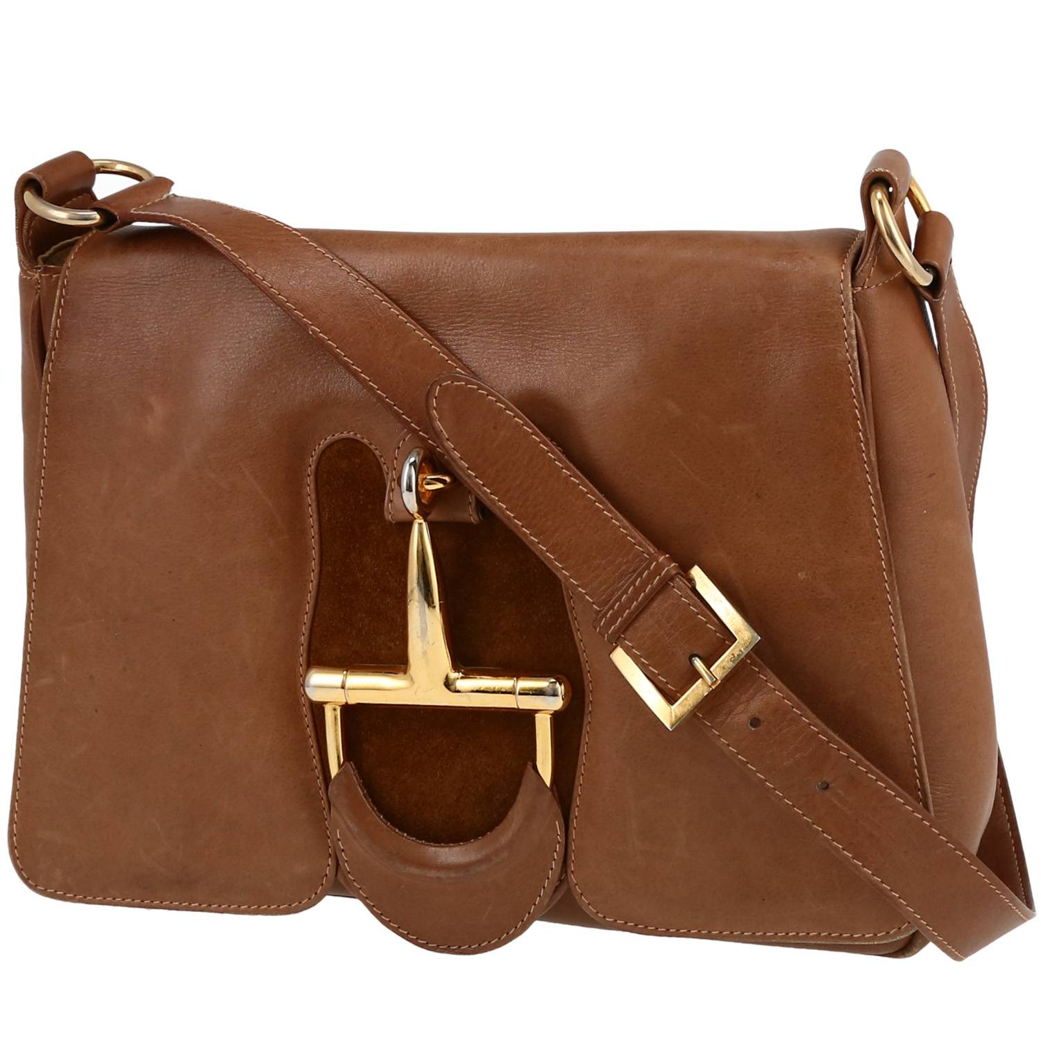 Magnífico bolso de mano Gucci de cuero marrón, adorno en metal dorado, bandolera ajustable de cuero marrón para llevar en la mano o al hombro.