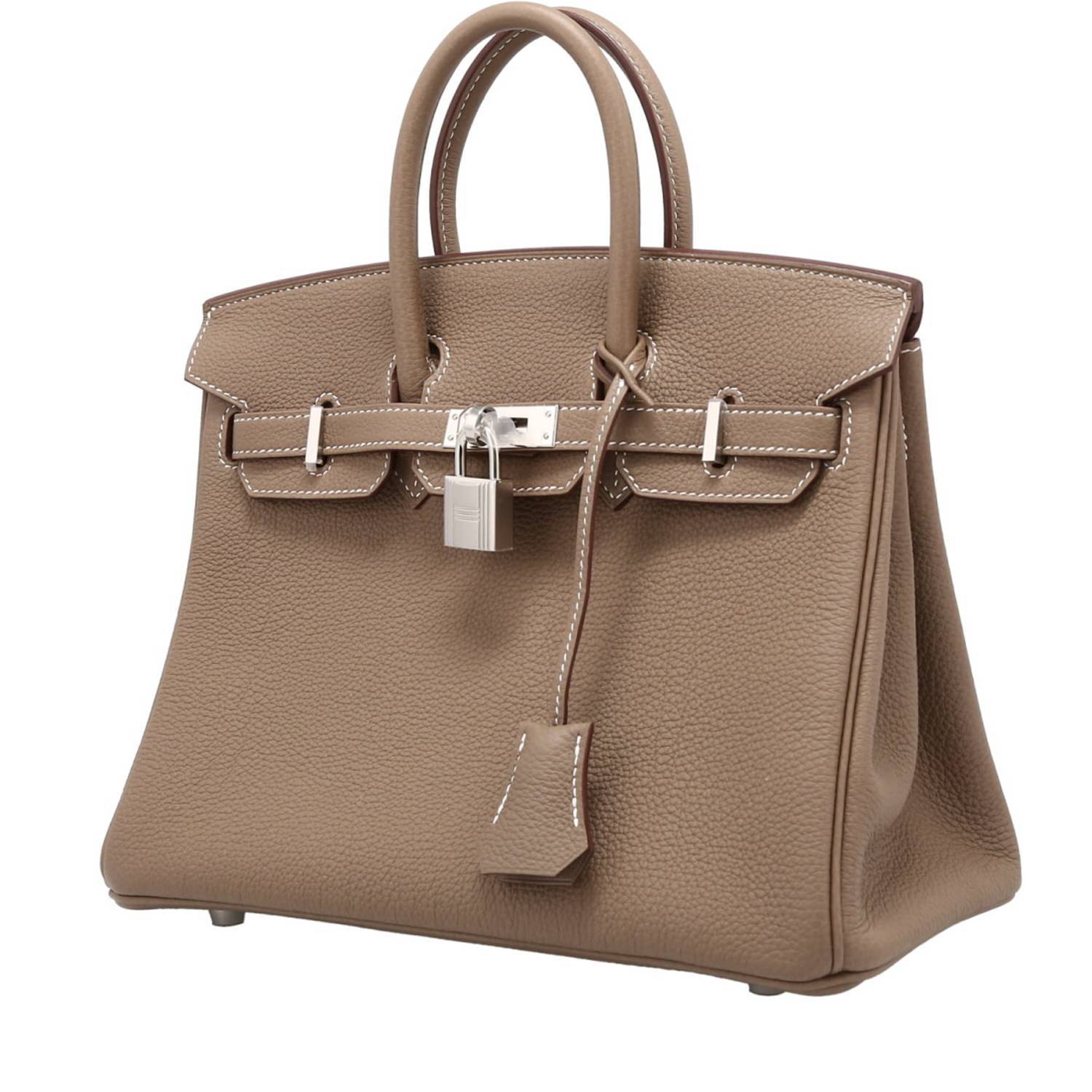 Inconfundible bolso de mano Hermès Birkin 25 cm de cuero togo etoupe, adorno en metal paladio, pespunte guarnicionero blanco, doble asa de cuero marrón etoupe para llevar en la mano.