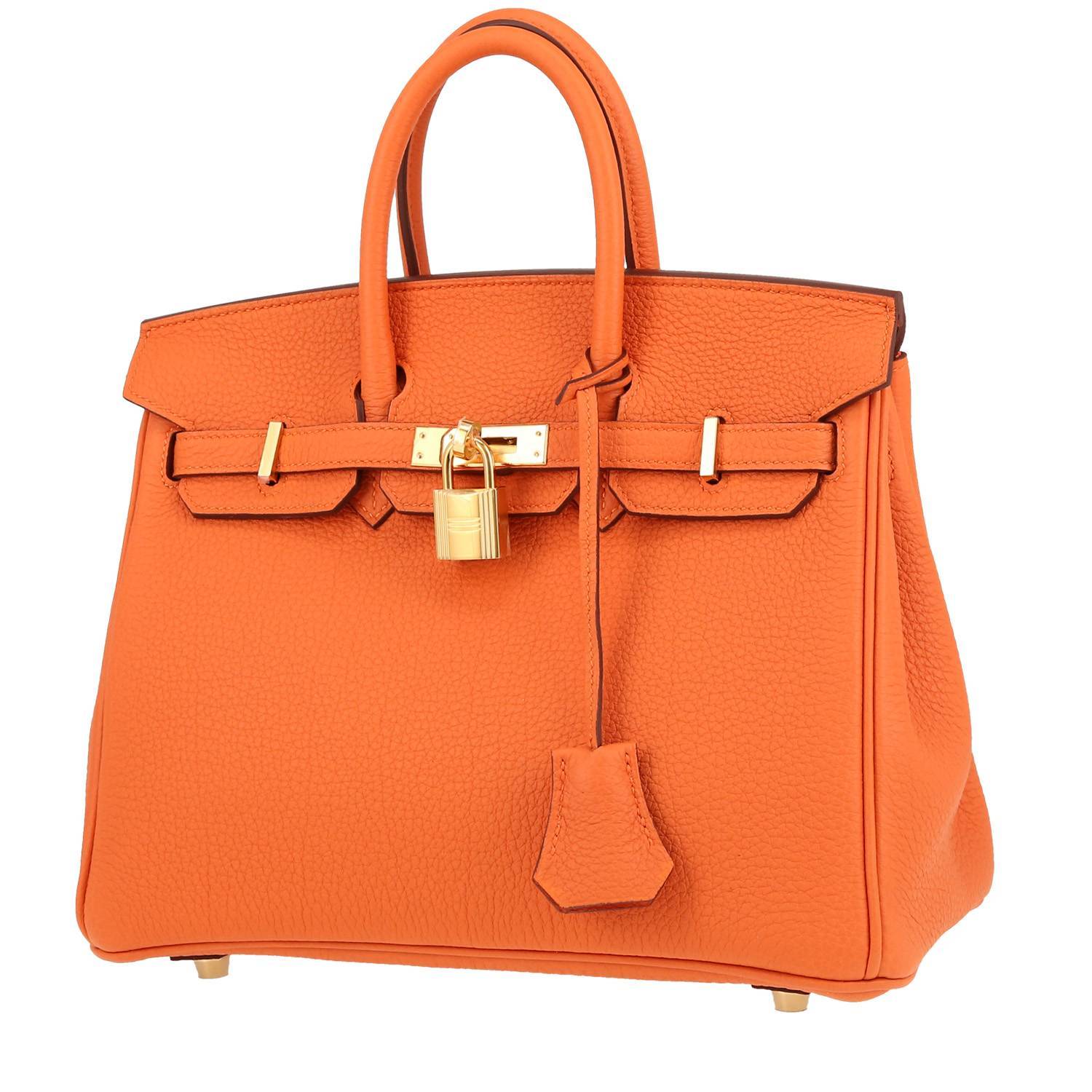Magnífico bolso de mano Hermès Birkin 25 cm de cuero togo naranja, adorno en metal dorado, doble asa de cuero togo naranja para llevar en la mano.