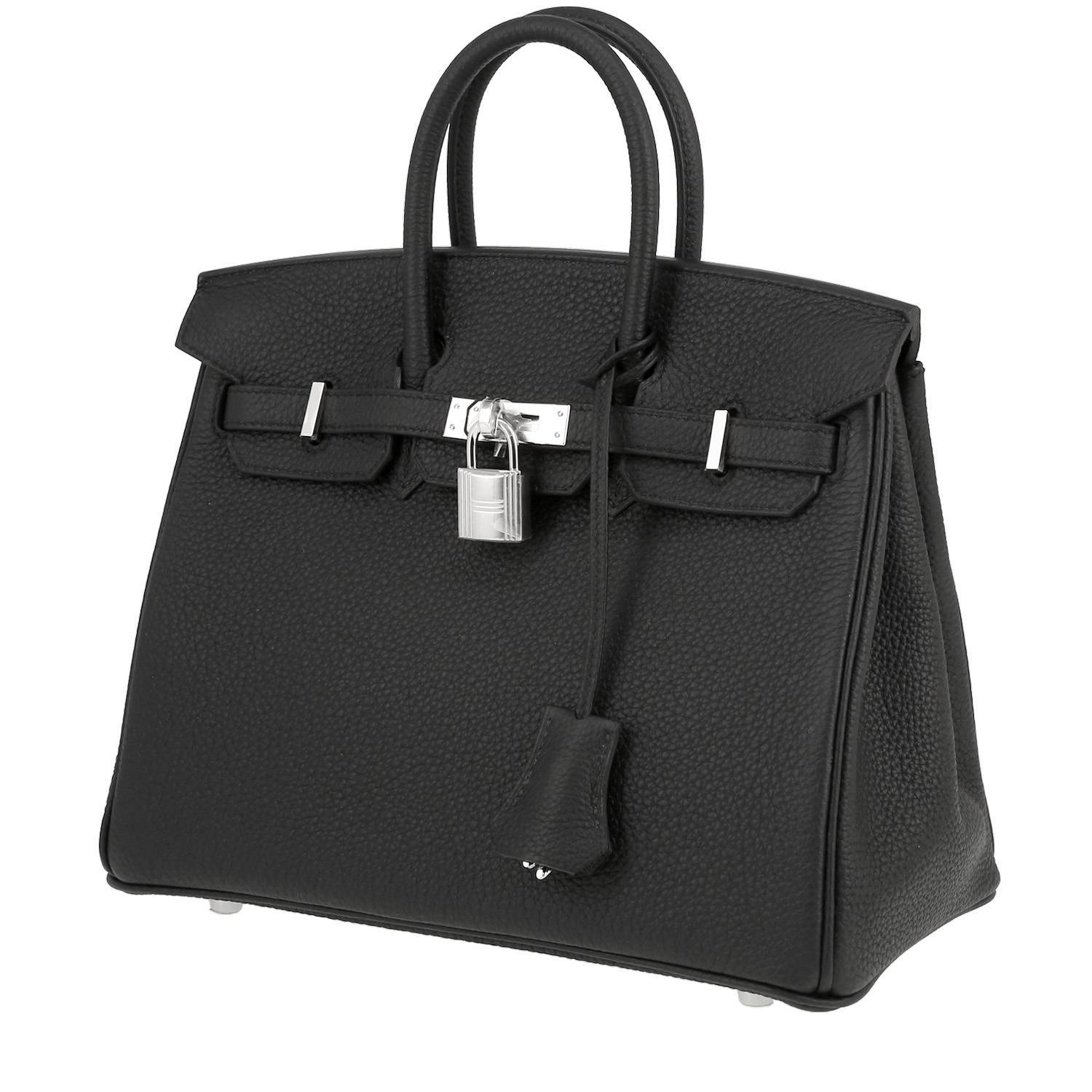 Famoso bolso de mano Hermès Birkin 25 cm de cuero togo negro, adorno en metal paladio, doble asa de cuero togo negro para llevar en la mano.