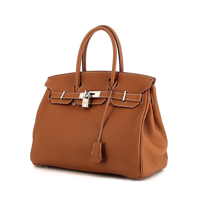 Magnífico bolso de mano Hermes Birkin 30 cm de cuero taurillon clémence color oro, adorno en metal paladio, sobrecosturas blancas, doble asa de cuero color oro para llevar en la mano.